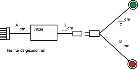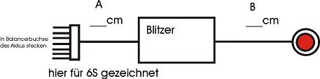 Wenn nichts weiter angegeben wird, so wird der Blitzer mit folgenden Kabellängen ausgeliefert: 3S: A=18cm, B=12cm 5S: A=20cm, B=20cm 6S: A=25cm, B=20cm